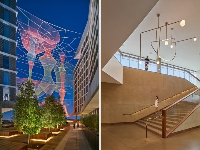 Designed by SOM and located on the iconic Sunset Strip in Los Angeles, The Jeremy Hotel holds two restaurants, a rooftop lounge, meeting spaces, and other private and public amenities. In designing the 388,000-square-foot boutique hotel, SOM collaborated with artist Janet Echelman to develop and integrate a sculpture titled The Dream Catcher. Suspended between the hotel’s two towers, the 65-foot-tall fiber netting structure distinguishes the plaza.