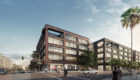 The office interiors are open concrete structures, finished to accommodate high ceilings and generous amounts of daylight. Each floor, unobstructed from north to south, features operable windows that provide cross-ventilation and views of the San Gabriel Mountains. Balconies on the upper floors capitalize on Southern California’s temperate climate.
