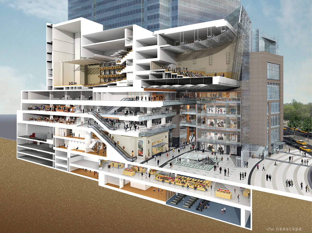 Deutsche Bank Center, originally known as Time Warner Center, brings an array of urban amenities into a single building at a prominent corner of Central Park. It encompasses five levels of retail and restaurants, a performing arts center, condominiums, a hotel, and offices, along with direct access to subway service and underground parking. For more than a decade, the building housed CNN’s New York television studios. Its health club was among the largest ever built at the time, and its lower level became New York City’s first Whole Foods.