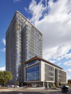 The podium embraces the street and adjacent public plaza with a pedestrian-friendly design that respects the scale of surrounding buildings. A public arcade, framed with wood to add texture and warmth, opens out to Broadway and serves as the building’s main entrance. A multi story atrium punctuates the interior of the office floors, with an open staircase connecting workplace levels. On the fifth floor of the tower, a wide outdoor terrace and glass-enclosed, multifunction ballroom and conference space overlooks the public plaza.