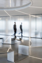 The Cognitive Lab is a clean, contemporary space and a neutral backdrop for multiple settings and uses—with mirror-backed glass walls, concrete floors, and LED lights that continue through the floor, walls, and ceiling. A 40-foot-long curved LED screen can be moved effortlessly from the adjoining board room into the Cognitive Lab, transforming the light-filled interior into an immersive technological environment. At the center of the space, a custom-designed metal bench puts users at the center of the show.