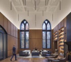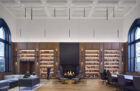 On the third floor, visitors are invited into the reimagined Alexander Heard Suite. The room’s original coffered ceiling has been restored and outfitted with an array of contemporary pendant lights. Gridded walnut wood paneling lines the room, integrating shelving with warm backlighting. The room’s original windows, previously replaced by aluminum-framed storefront windows, have now been restored with historically appropriate wood frames with insulated glazing, concealed shades, and bronzed metal sills and jamb liners. A fireplace surfaced in angled steel panels adds a touch of modernity, and the room’s furniture is arranged for different types of meetings, offering conference tables or sofas for more intimate gatherings.