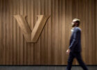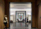 The redesign has transformed the entry procession, aiming to elevate the experience for donors and other campus visitors. Three wings are connected by two main corridors in a cross-shaped floor plan, with load-bearing masonry walls defining much of the central pathways. Upon entering the building, guests traverse the walnut-clad vestibule on the second floor, leading to the central gallery showcasing the new school seal inlaid in the dark granite floor. An opening in the ceiling above connects the second and third floors, revealing a bas-relief insignia of the north star from the university’s logo on the third-floor ceiling. The double-height central gallery features a variety of seating arrangements, including sofas and chairs for informal gatherings, with views of the upper mezzanine.