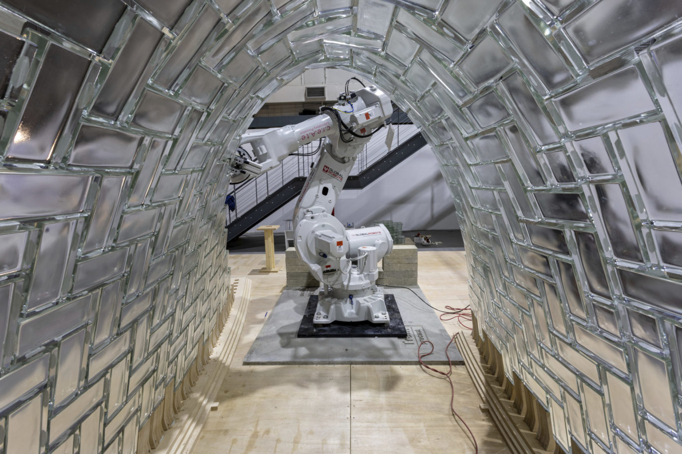 Structural engineers at SOM developed the installation in collaboration with Princeton University CREATE Lab and Form Finding Lab, with assistance from the TU Delft Glass & Transparency Research Group. The robotic arms were provided by Global Robots and the glass bricks were provided by Poesia Glass Studio. Combining its expertise, the team developed a material system, structural design, and assembly strategy to enable robotic arms to assemble a self-supporting vault. The research behind this installation draws upon traditional vault construction methods while applying advanced engineering techniques to create an efficient and beautiful shell structure that can be built entirely without formwork or guides.